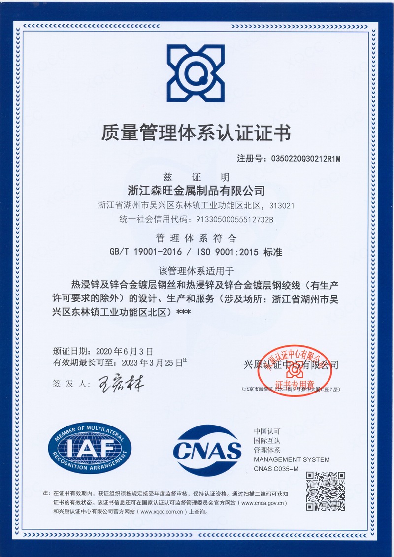浙江森旺金屬制品有限公司成立于2012年,坐落湖州市吳興區東林鎮工業功能區。公司專業從事各類鍍鋅鋼絲、鋼絞線等產品的開發及生產。目前產品已廣泛應用于各類通信光電纜,電力輸送,電氣化鐵路工程,各類堤壩防護及農業溫室等工程領域。公司秉承“追求卓越品質,創建卓著信譽”的經營理念,始終堅持專業化、規?;慕洜I模式。